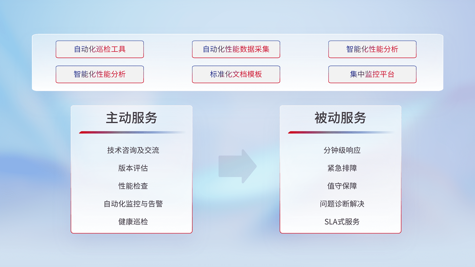 智能化工具和标准化文档,,保障服务质量,,,提供主动服务(包含技术咨询、、、、版本评估、、、、性能检查、、、自动化监控与告警、、、健康巡检)和被动服务包含(分钟级响应、、、、紧急排障、、值守保障、、问题诊断解决、、SLA服务)。。。