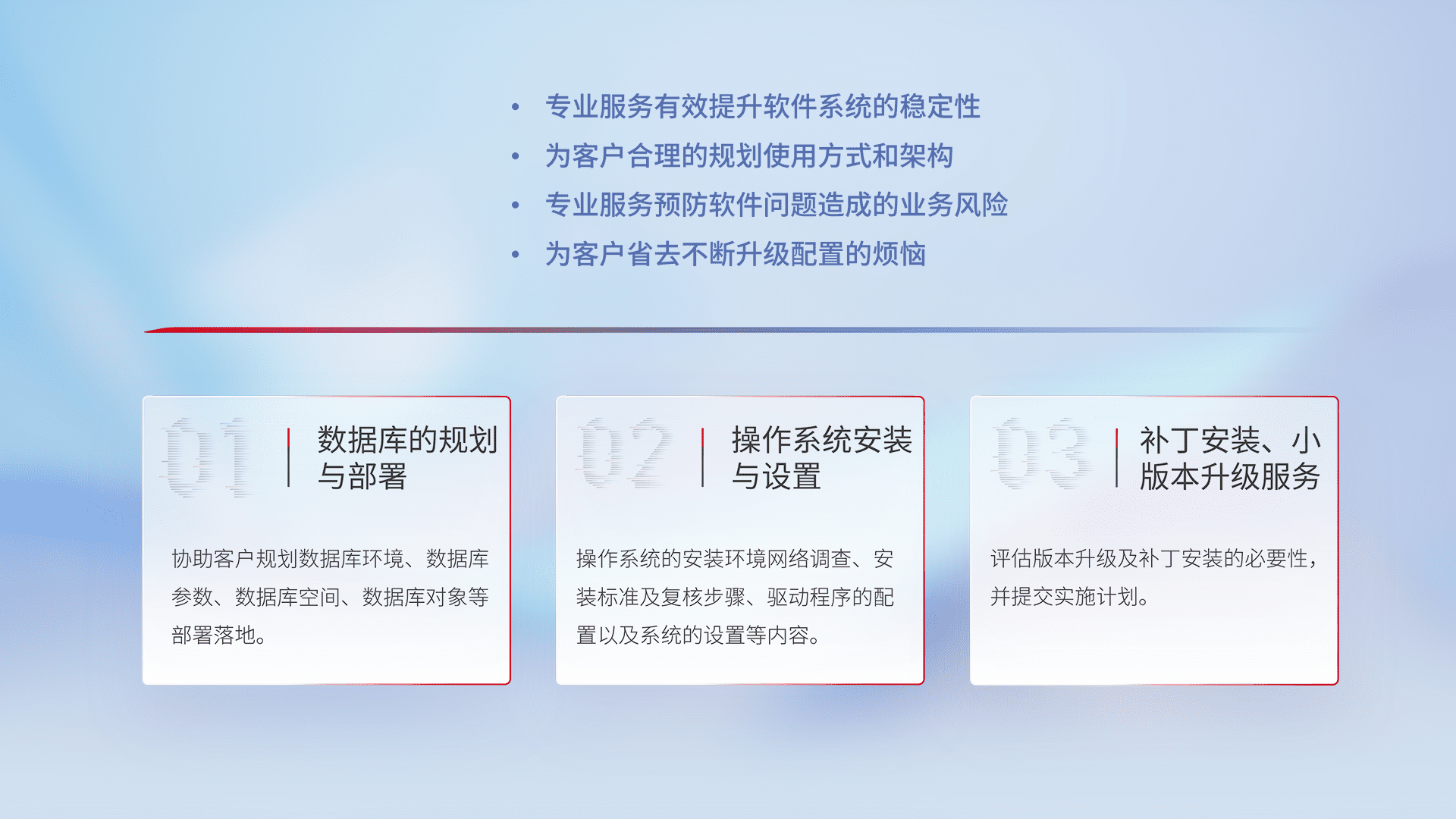 为客户提供软件规模升级、、、快速部署、、、、按需配置的专业服务,,,从数据库的规划与部署到操作系统的安装与设置,,再到补丁安装和小版本升级提供支持。。。